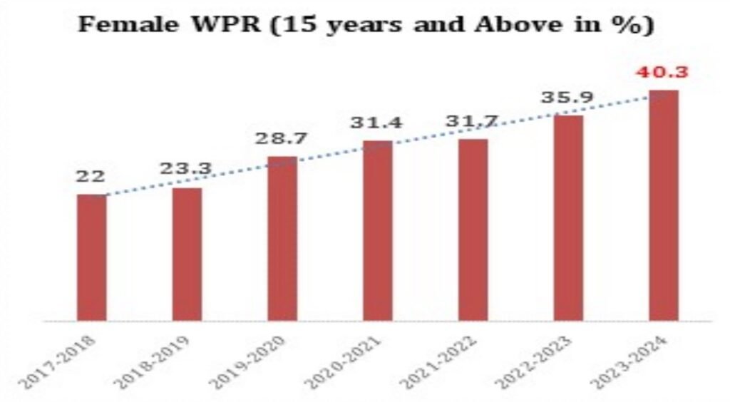 : PLFS द्वारा मापी गई महिला कार्यबल भागीदारी दर (WPR), जो आर्थिक गतिविधियों (स्व-रोजगार, नियमित नौकरियां, आकस्मिक श्रम) में संलग्न महिलाओं की हिस्सेदारी को दर्शाती है।