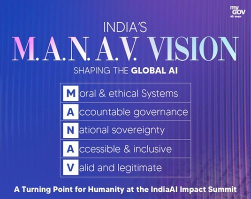: भारत के प्रधानमंत्री ने इंडिया AI इम्पैक्ट समिट 2026 में M.A.N.A.V. विज़न पेश किया, जिसमें आर्टिफिशियल इंटेलिजेंस गवर्नेंस के लिए भारत के ह्यूमन-सेंट्रिक अप्रोच को बताया गया।